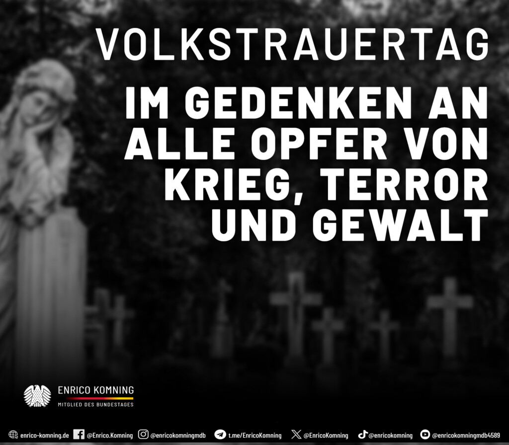 Am heutigen Volkstrauertag gedenken wir allen Opfern von Krieg, Terror und Gewalt. Wir gedenken heute aber auch unseren Soldaten, die in Erfüllung ihrer Pflicht auf dem Schlachtfeld gefallen sind. Der heutige Tag erinnert uns daran,