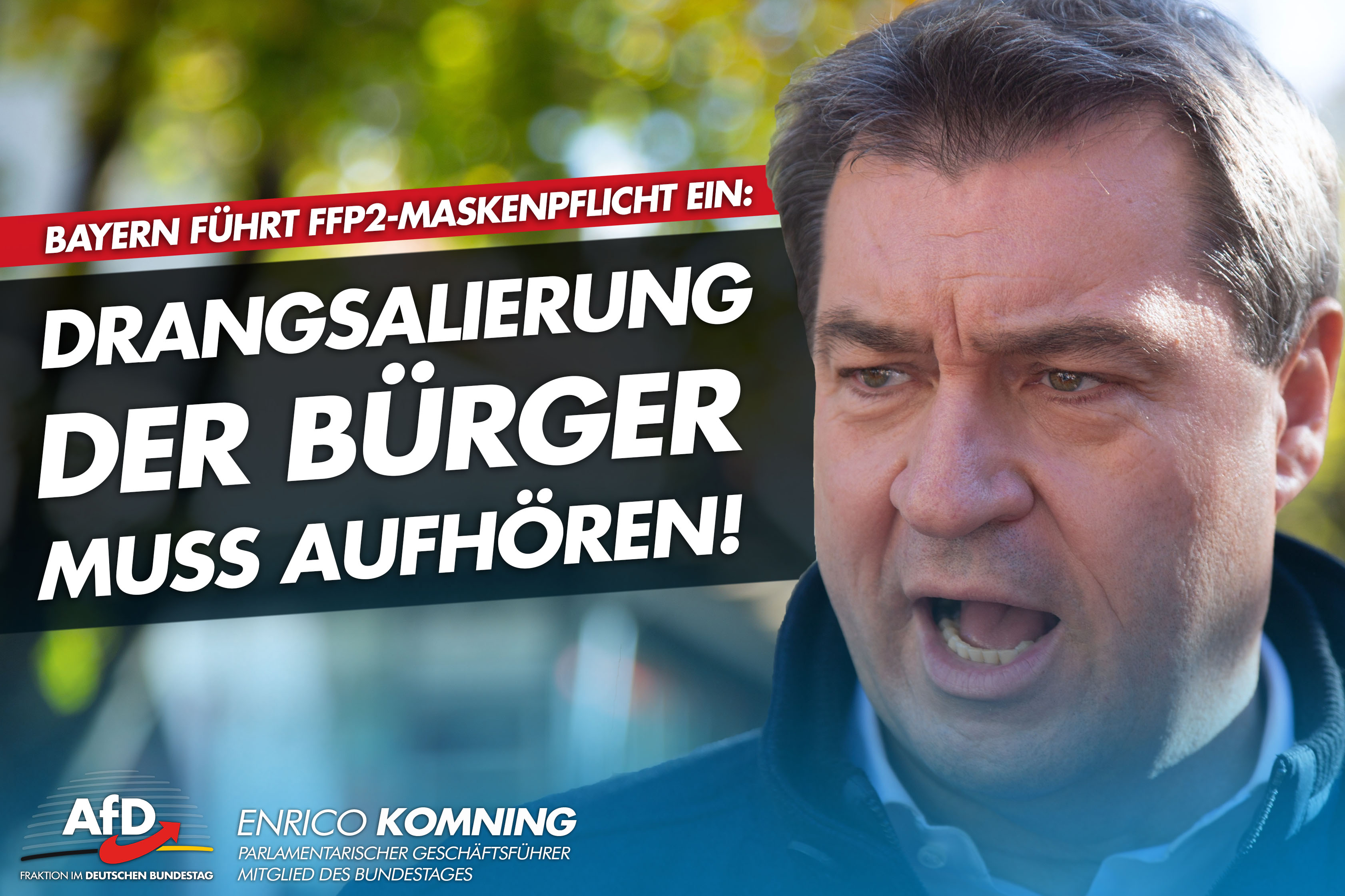 Bayerns Ministerpräsident Markus Söder (CSU) hat angekündigt, dass in seinem Bundesland nun eine Tragepflicht von FFP2-Masken in öffentlichen Verkehrsmitteln und im Einzelhandel besteht. Immer, wenn man sich denkt, dass es nicht mehr schlimmer werden kann, beweist Söder stets das Gegenteil. Mal abgesehen davon, dass es weiterhin fraglich bleibt, ob es überhaupt genug FFP2-Masken für die alle vorhanden sind. Nicht zu vergessen, dass Söder sogar über eine Impfpflicht für bestimmte Berufsgruppen nachdenkt.