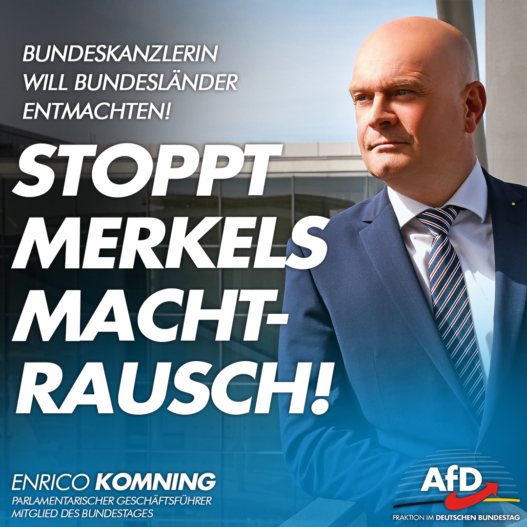Wenn der Bund durch das schon ohnehin umstrittene Infektionsschutzgesetz weiter Macht an sich zieht, öffnet dies Tür und Tor für eine von oben herab angeordnete Bevormundung aller Bürger. Merkels Machtrausch muss umgehend gestoppt werden!