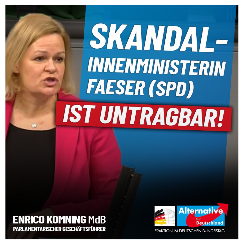 Bundeskanzler Olaf Scholz (SPD) muss umgehend handeln, wenn ihm die innere Sicherheit tatsächlich wichtig ist. Jemand, wie Frau Faeser, die in linksextremen Zeitschriften Artikel verfasst, nur den Rechtsextremismus als Problem ansieht und dadurch weitere dringende Gefahren für unser Land – vielleicht auch bewusst – aus den Augen lässt, ist untragbar.