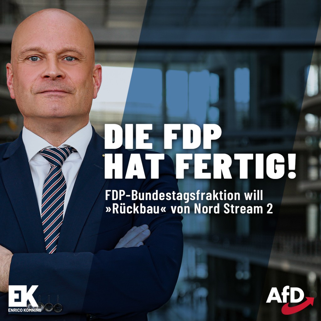 Es ist schön und gut, dass Bundestagsvizepräsident Kubicki (FDP) unsere Forderung nach der Öffnung von Nord Stream 2 übernommen hat, dennoch steht er offensichtlich alleine da. Seine Kollegen gerieren sich lieber zum Steigbügelhalter einer Politik von Scholz und Habeck, die unser Land mit Vollgas gegen die Wand fahren wird.