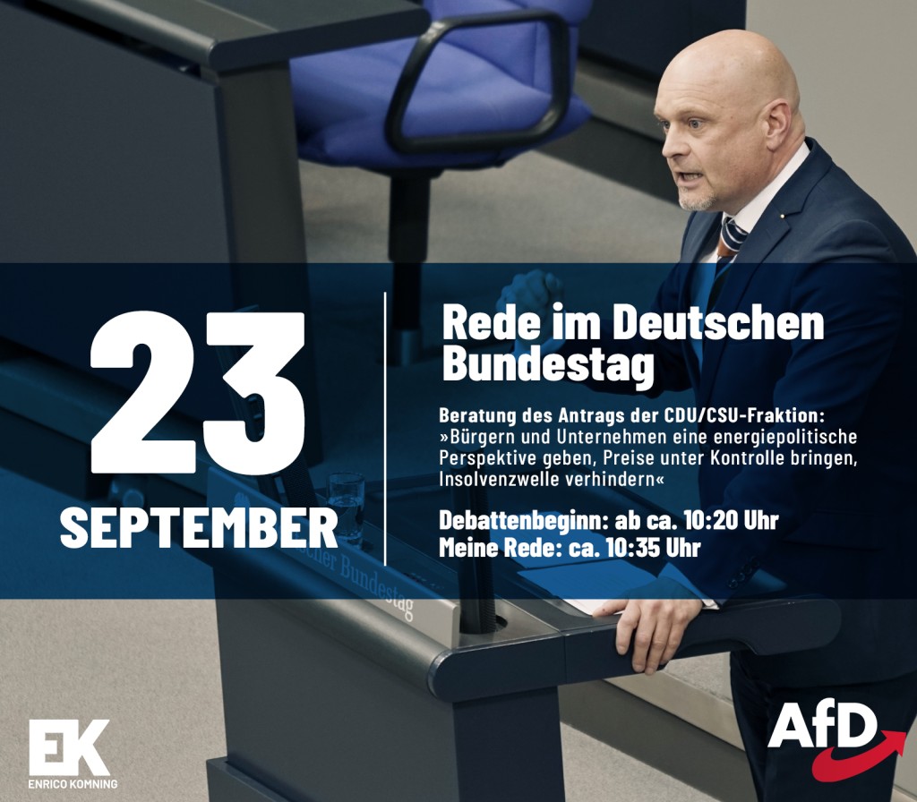 Der Bundestag befasst sich am kommenden Freitag mit den Folgen der von den Altparteien herbeigeführten Energiekrise. Die CDU/CSU-Fraktion hat einen Antrag mit dem Titel „Bürgern und Unternehmen eine energiepolitische Perspektive geben, Preise unter Kontrolle bringen, Insolvenzwelle verhindern“ angekündigt. Dazu werde ich im Plenarsaal eine Rede halten, also nicht verpassen!